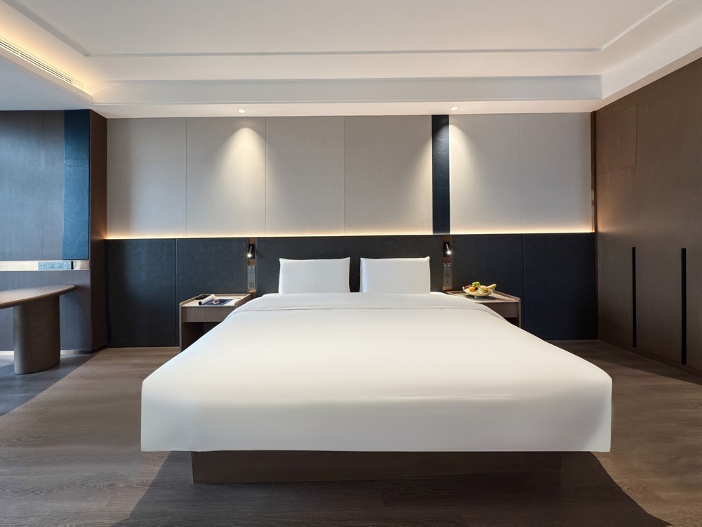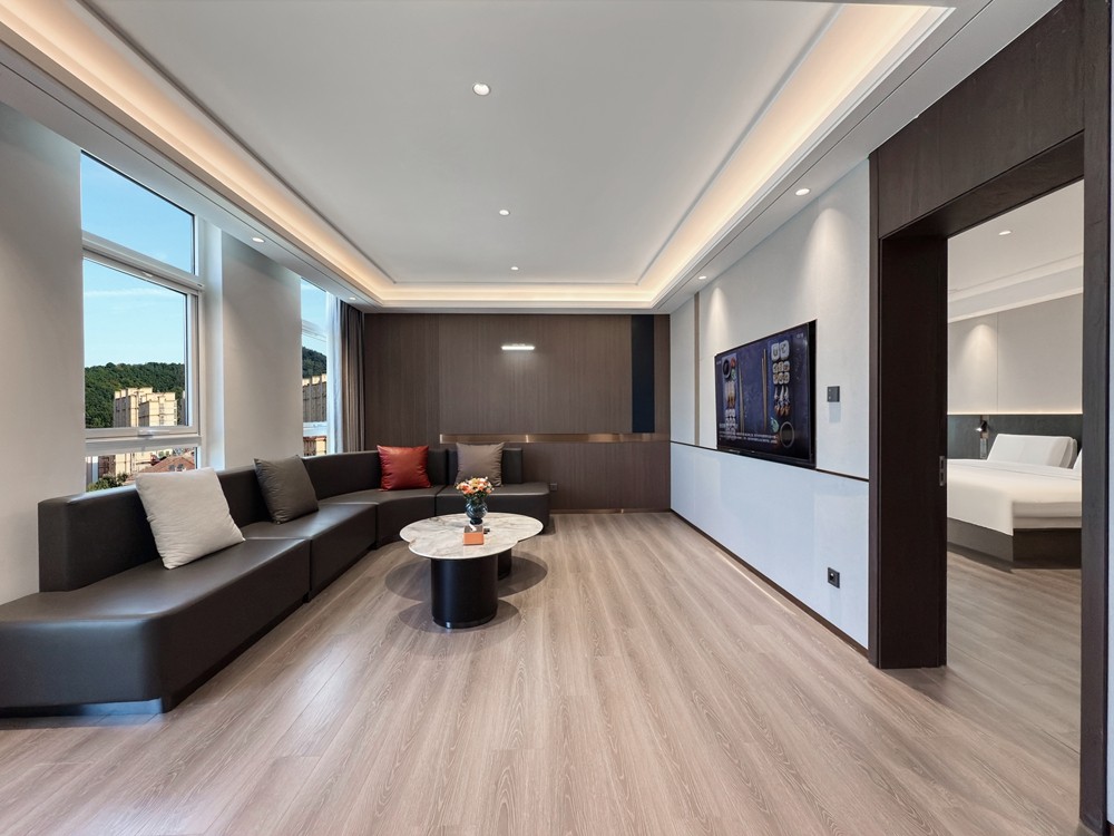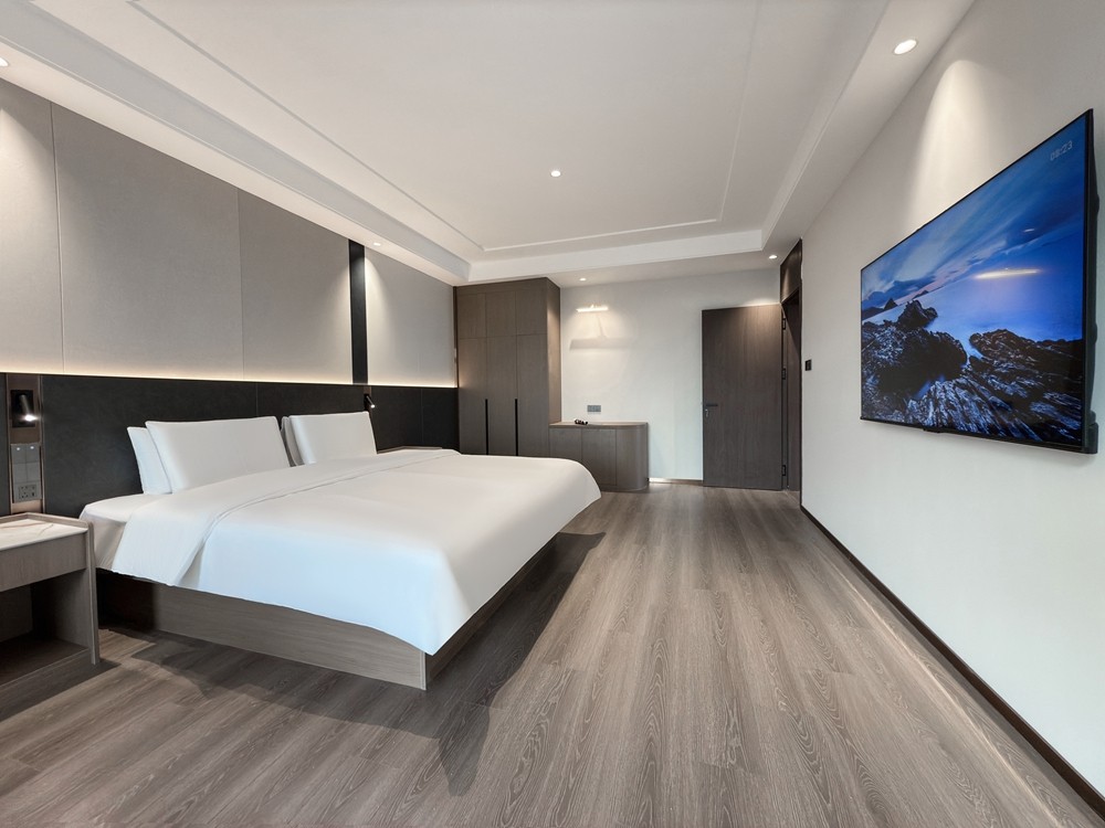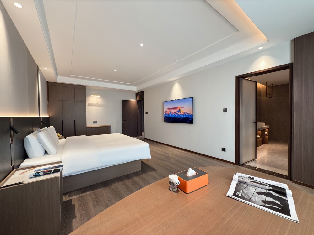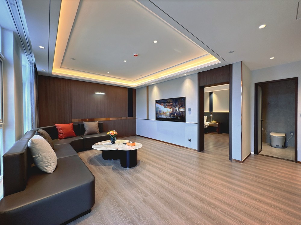 豪华套房大床以“每层仅 1 间”的稀缺性、79㎡的阔绰空间及“卧室 + 客厅 + 双卫”的全能布局,精准匹配商务精英、情侣度假或品质家庭的高阶需求,既能保障私密休憩,又能满足会客、居家般的舒适体验,是追求住宿品质的优选。卧室配备 2.0m×2.0m 超大豪华大床,卧室与客厅各配一台高清智能电视,支持投屏、影视会员与多频道选择。卧室可躺着追剧放松,客厅可陪家人看电影或商务会客时播放背景内容,满足不同场景的娱乐与社交需求。房间配备嵌入式迷你冰箱,容量满足多日入住需求,可存放饮品、水果、面膜或孩子的辅食,避免食材变质,还原居家般的便捷,尤其适合长住或带娃家庭。